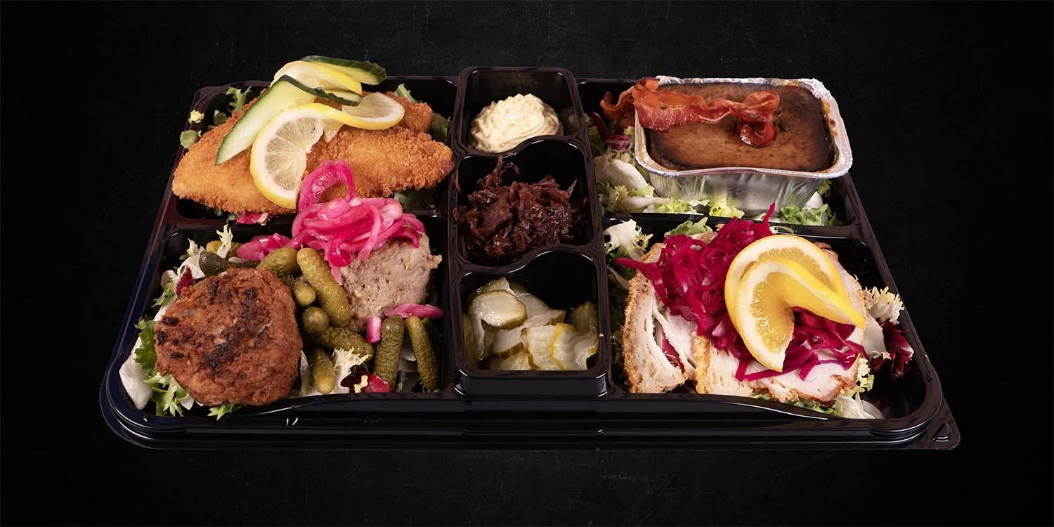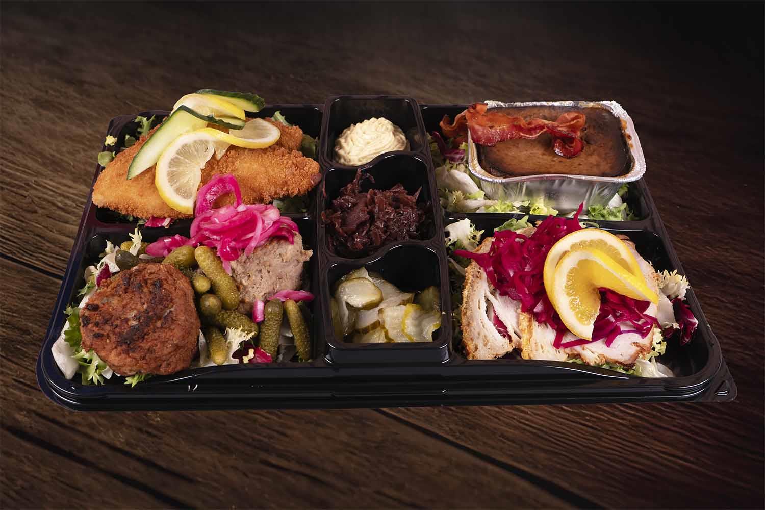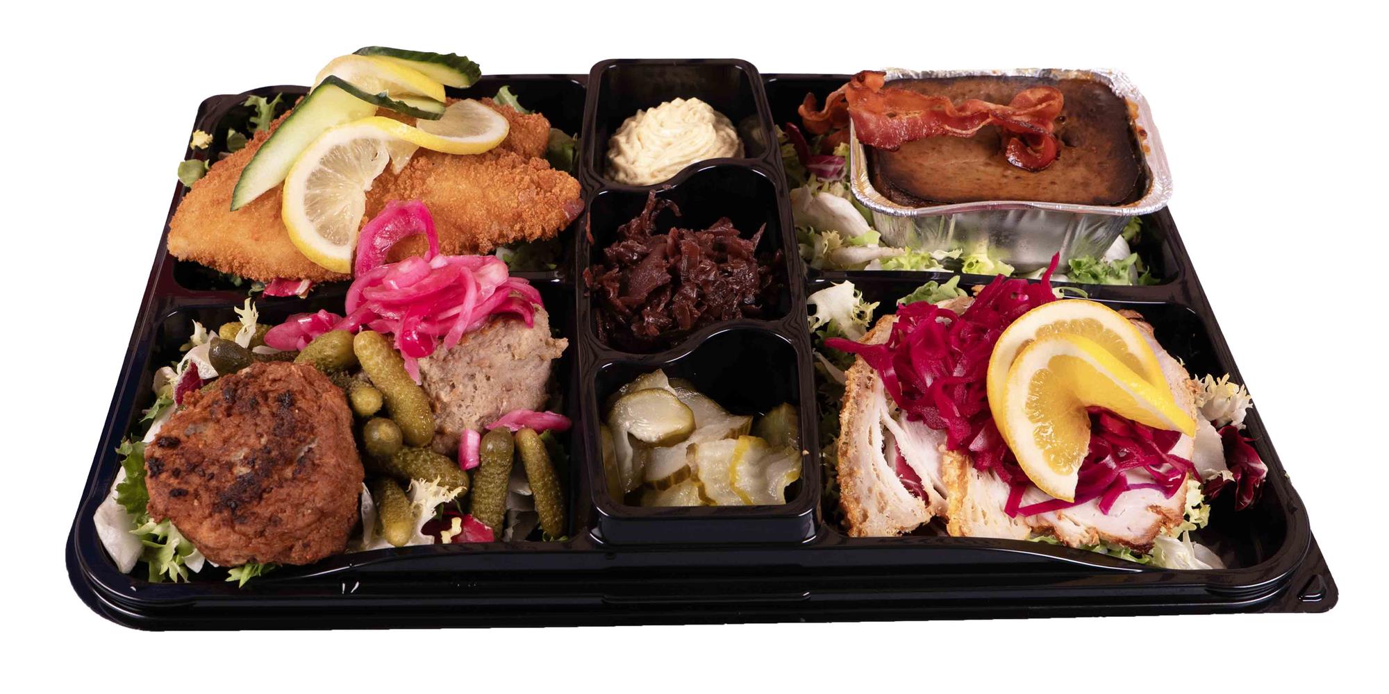 Kamsteg m/rødkål- fiskefilet m/remoulade - frikadeller m/agurkesalat- dagens mayo salat
